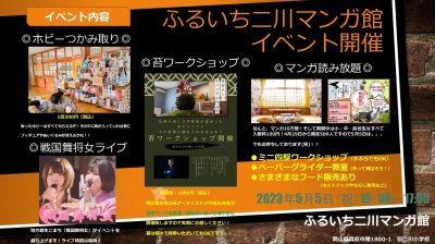 2023年05月05日 | SDGs取組、二川まんが館5/5(日)の子どもの日🎏 真庭市の 『ふるいち二川マンガ館』で久々のイベントを開催しました🚗💨 大人気のホビーつかみ取り🤖 可愛い🎤戦国舞将女ライブ 🌿苔ワークショップ 🏎ミニ四駆に📚マンガ読み放題に いろんなフードも来てくれました🍙