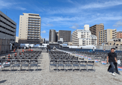 見てください↓すっごい椅子の数!!いい天気♪遠くに見える壇上でこれから100万円をかけた大会が始まります!!
